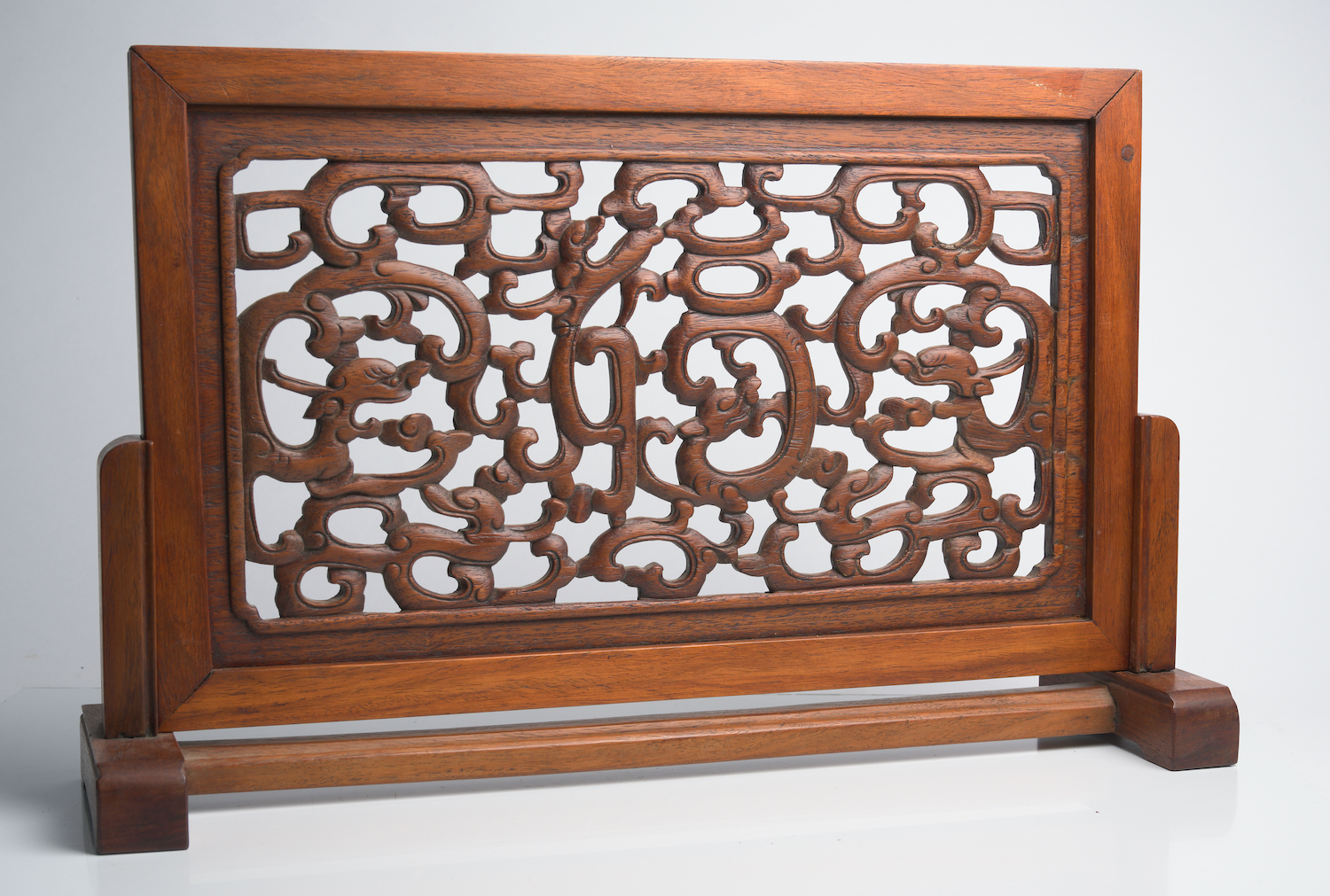 The pierced panel decorated with archaistic dragon scrolls, mounted later within a hardwood frame and stand.