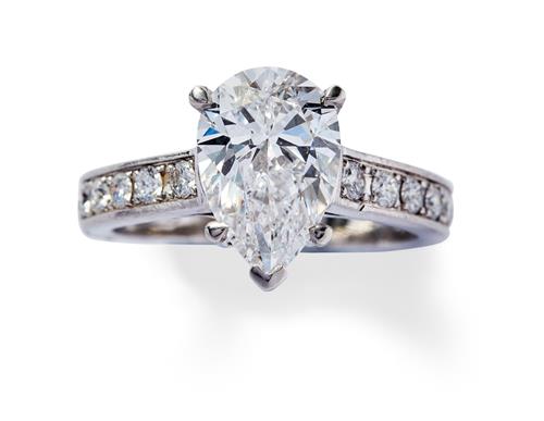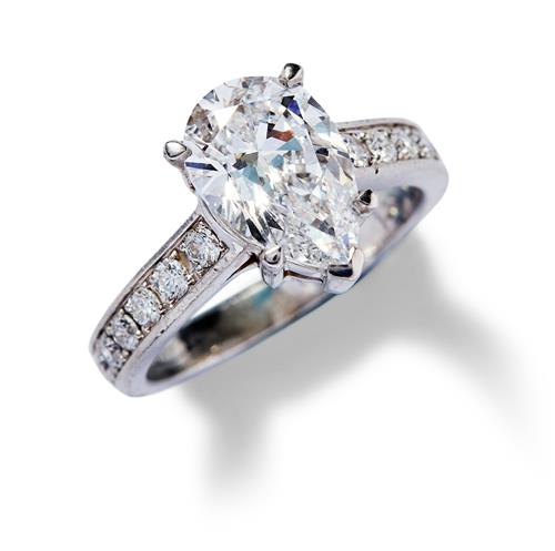 The claw-set pear-shaped diamond weighing 2.27 carats, to pavé-set brilliant-cut diamond shoulders, mounted in platinum, size K.