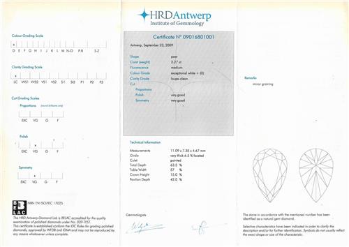 Accompanied by an HRD certificate numbered 09016801001, dated 23 September 2009, stating that the 2.27 carat diamond is exceptional white + (D) colour, loupe-clean clarity.