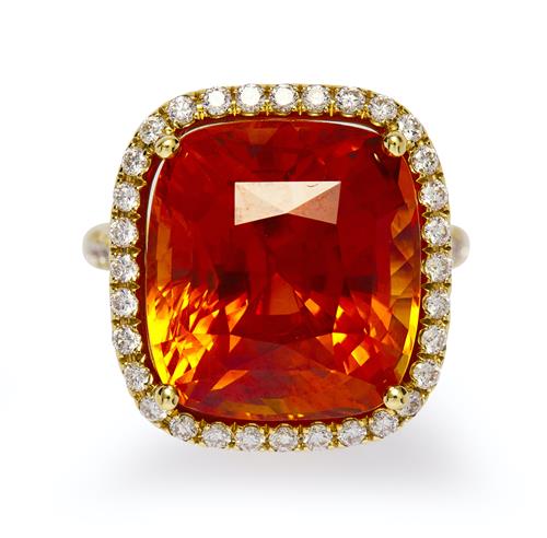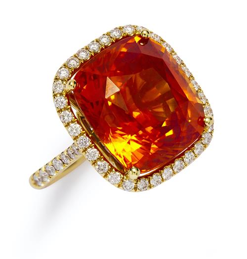 Of cluster design, centring a claw-set cushion-shaped orange sapphire weighing 20.22 carats, framed by an openwork surround pavé-set with brilliant-cut diamonds between similarly set shoulders, the diamonds together weighing approximately 0.72 carat, size M.