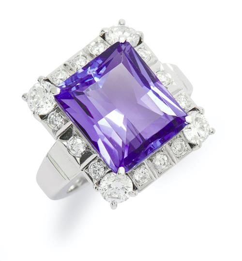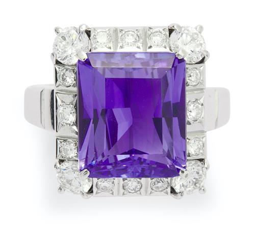 Of cluster design, centring a claw-set octagonal step-cut tanzanite weighing approximately 8.60 carats, framed by a line of 16 brilliant-cut diamonds, the diamonds together weighing approximately 1.31 carats, size N.
