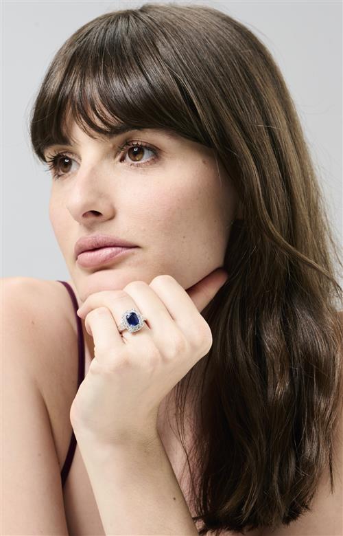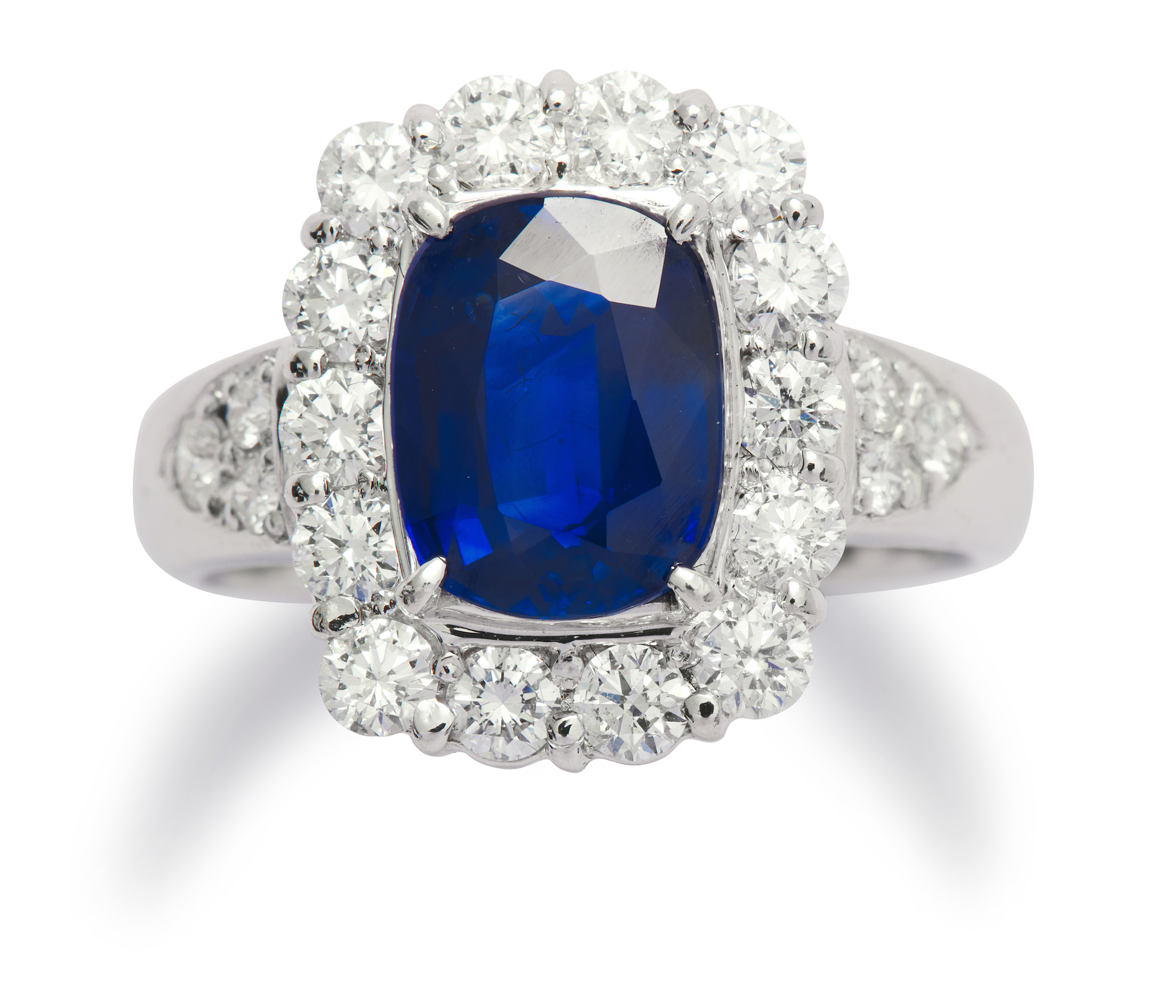 Of cluster design, centring a cushion-shaped sapphire weighing approximately 2.92 carats, claw-set within a frame of brilliant-cut diamonds, between similarly set shoulders, the diamonds together weighing approximately 1.12 carats, size M.