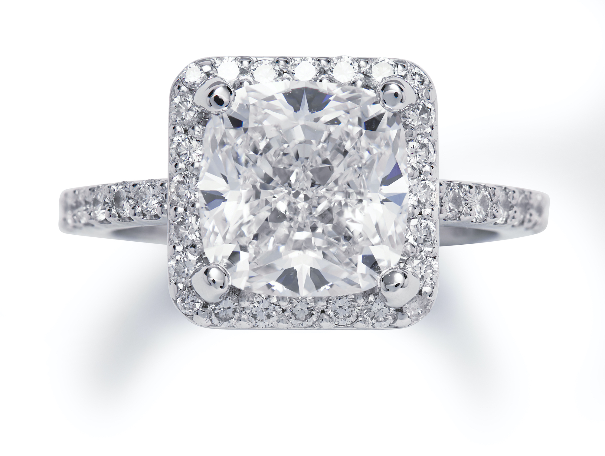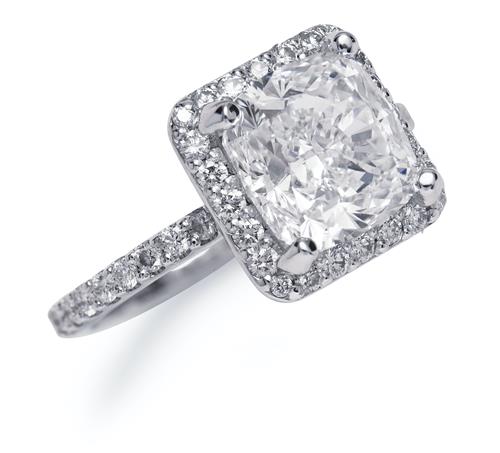 Of cluster design, centring a claw-set cushion-shaped modified brilliant-cut diamond weighing 4.06 carats, framed by a surround of pavé-set brilliant-cut diamonds, between similarly set shoulders, the small diamonds together weighing approximately 0.70 carat, size J.