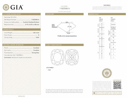 Accompanied by a GIA report numbered 1182058614, dated 5 December 2016, stating that the 4.06 carat diamond is D colour, VVS2 clarity, laser inscribed.