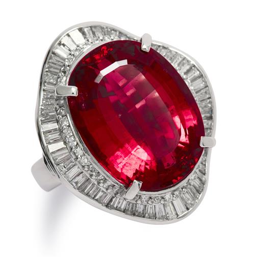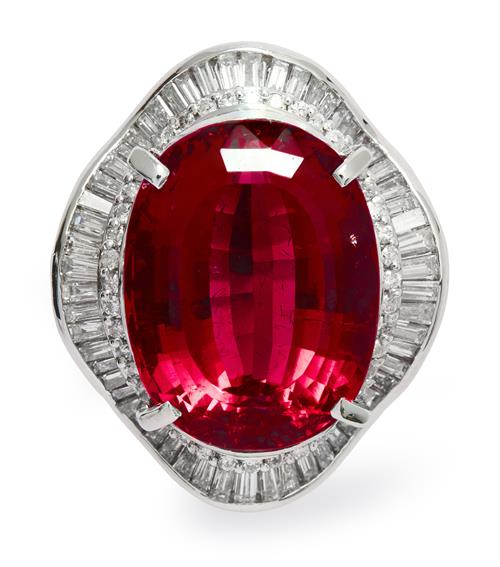 Of cluster design, centring a claw-set oval rubelite tourmaline stated to weigh 19.80 carats, framed by an undulating surround of brilliant-cut and baguette diamonds, the diamonds together weighing approximately 2.01 carats, size M.