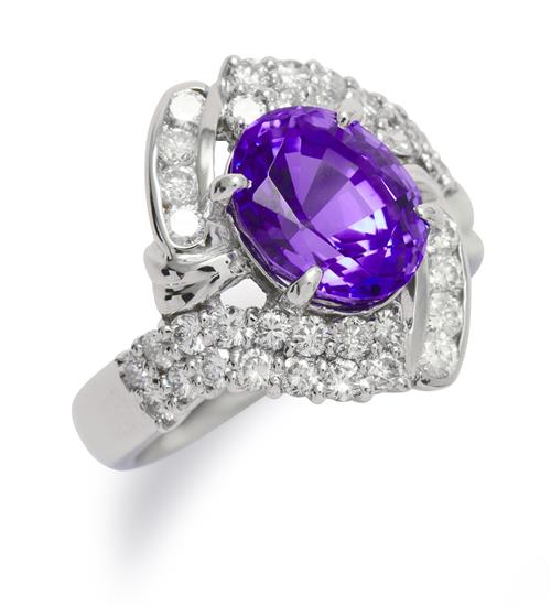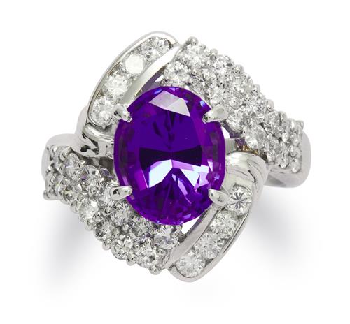 Of cluster design, centring an oval tanzanite weighing approximately 4.90 carats, framed by a crossover surround decorated with lines of channel-set and claw-set brilliant-cut diamonds, the diamonds together weighing approximately 1.32 carats, size M.