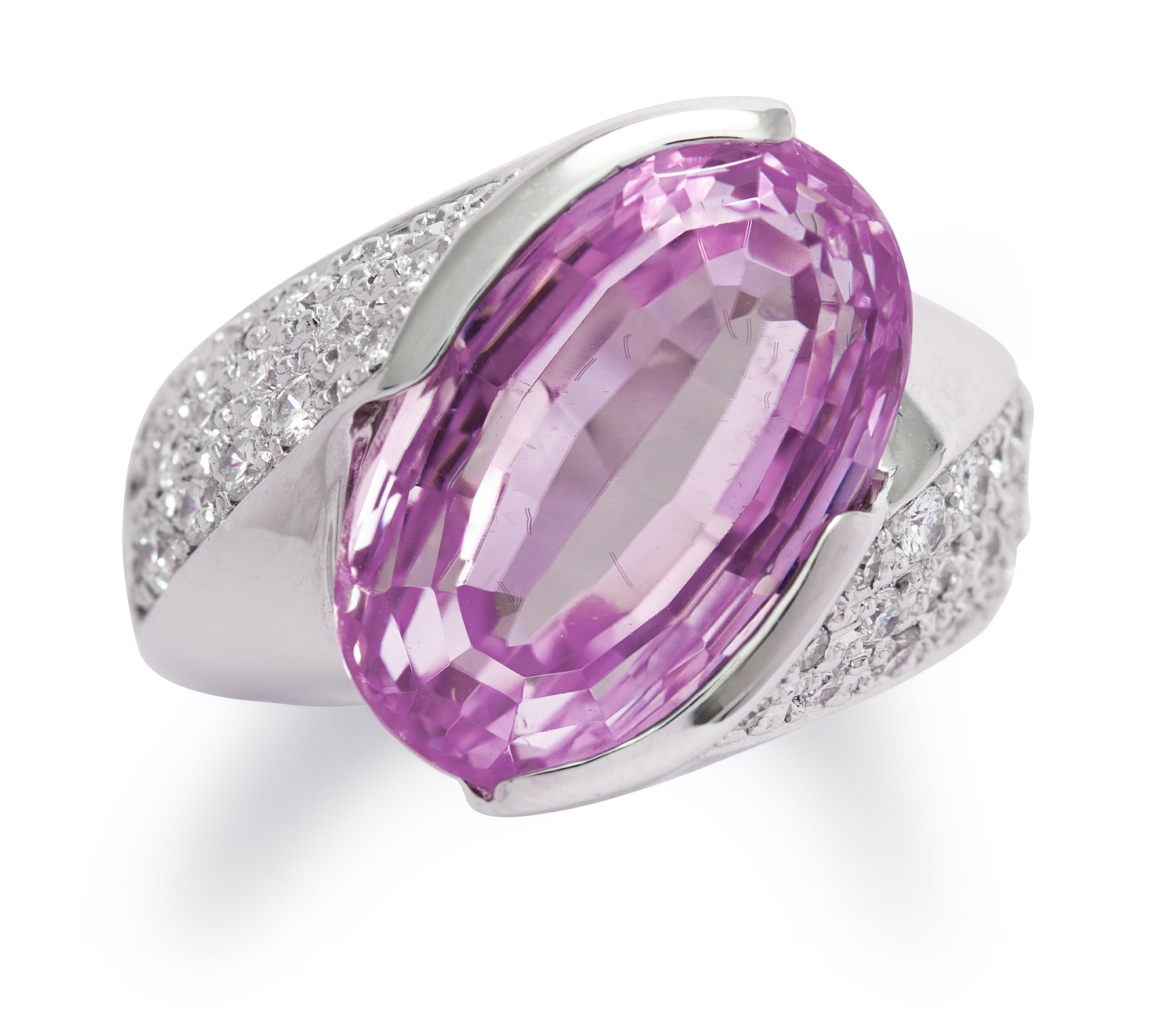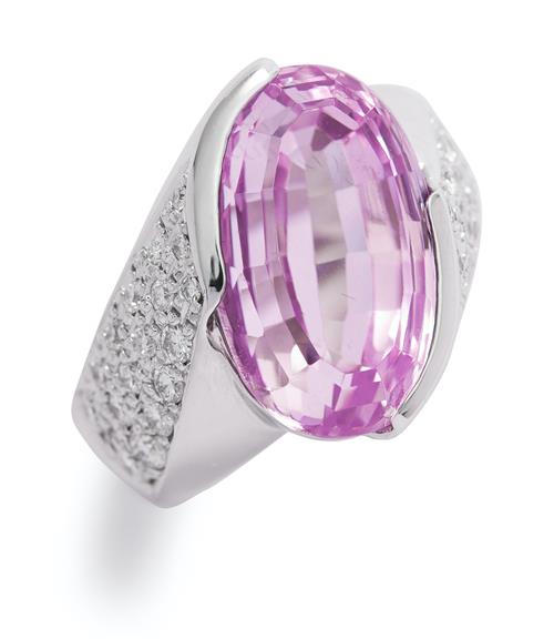 Of crossover design, centring a collet-set oval kunzite weighing approximately 11.00 carats, flanked by pavé-set brilliant-cut diamond shoulders, the diamonds together weighing approximately 0.88 carat, size Q1/2.