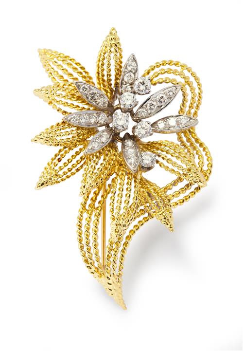 Designed as a stylised bouquet modelled in twisted wire, decorated with brilliant-cut diamonds, the diamonds together weighing approximately 1.40 carats, measuring approximately 45mm x 55mm, maker's mark DC, stamped France.