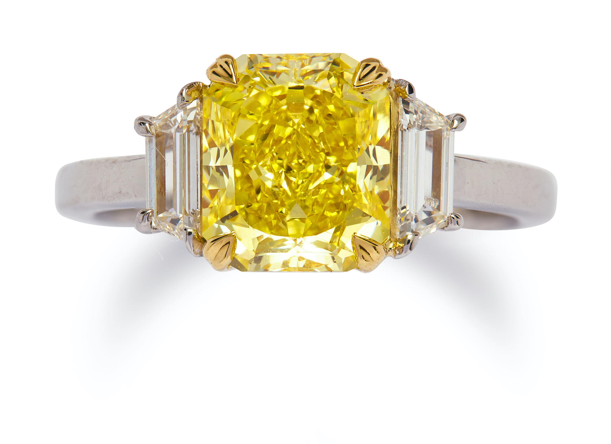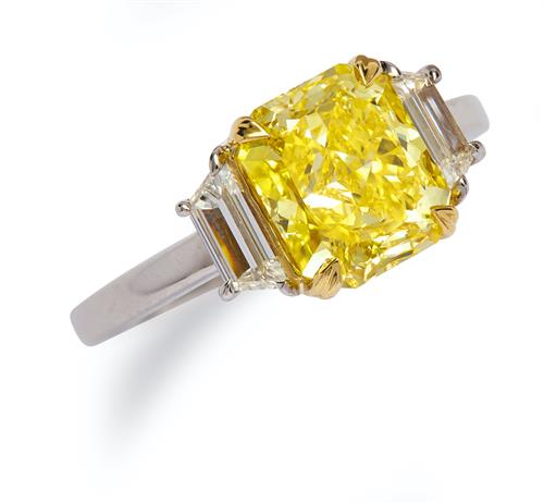 The natural fancy vivid yellow rectangular cut-cornered brilliant diamond weighing 2.52 carats, is claw-set between a pair of near colourless trapezoid step-cut diamonds together weighing approximately 0.37 carat, size M.