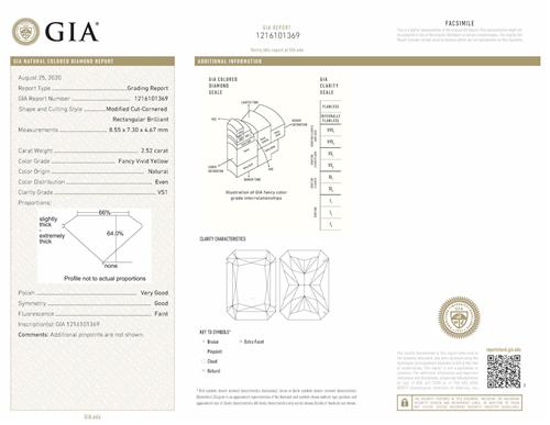a GIA report numbered 1216101369, dated 25 August 2020, stating that 2.52 carat diamond is natural, fancy vivid yellow colour, VS1 clarity, laser inscribed;