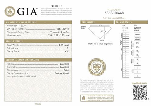 a GIA report numbered 5363630448, dated 11 November 2020, stating that the 0.18 carat diamond is E colour, VS1 clarity, laser inscribed;