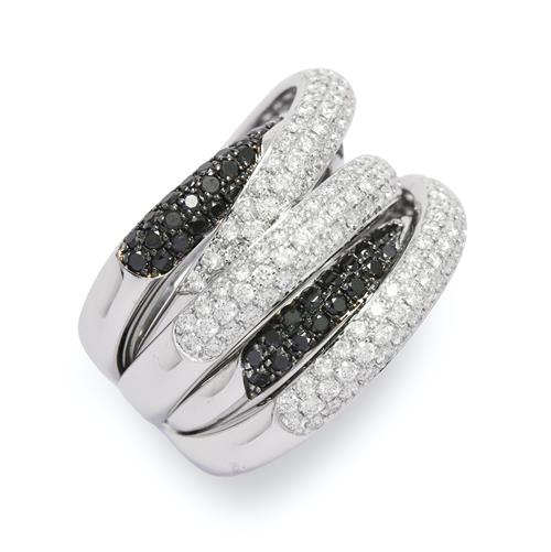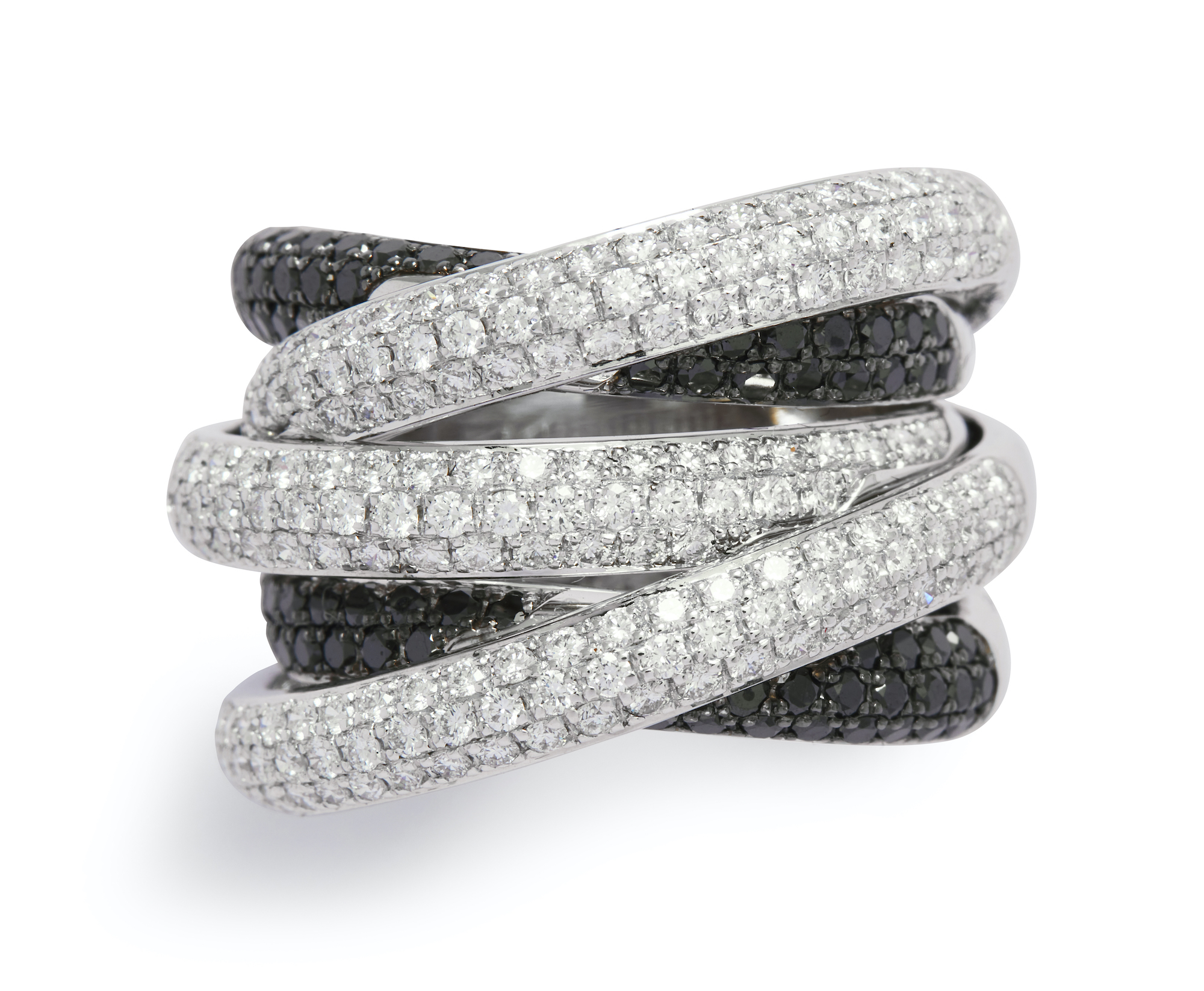 Modelled as five interlocking half round bands pavé-set to the top with near colourless and black brilliant-cut diamonds, the diamonds together weighing approximately 4.20 carats, signed Poniros, size O.