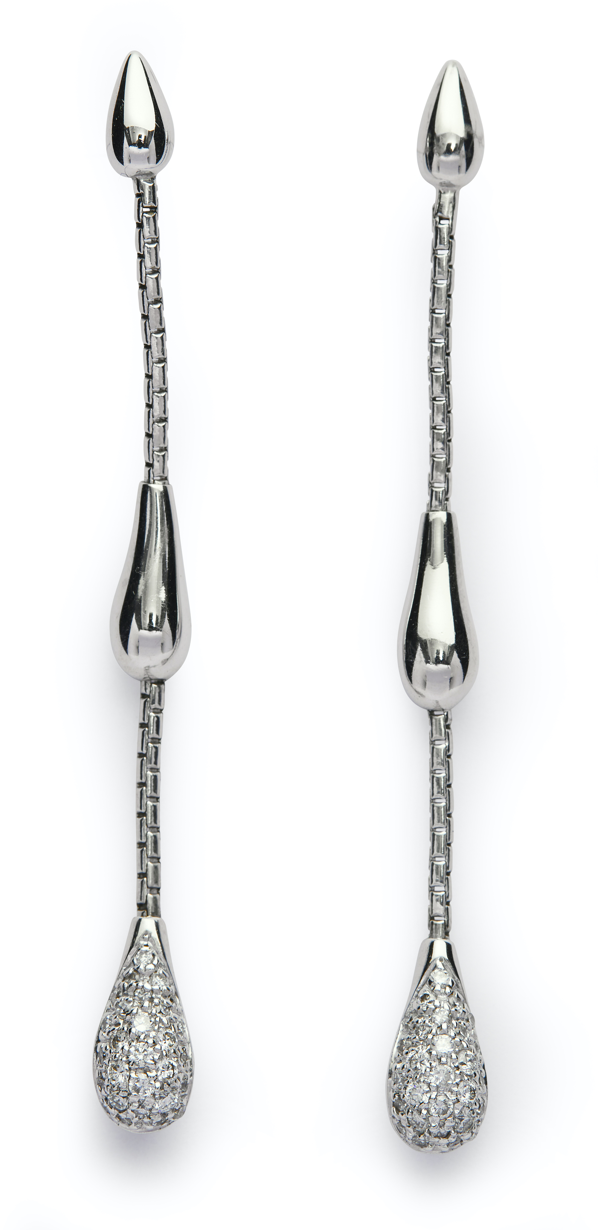 Each terminating in teardrop pavé-set to the front with brilliant-cut diamonds, supported from a similarly shaped surmount between box link connectors, length 55mm, maker's mark for H. Stern, post fittings.