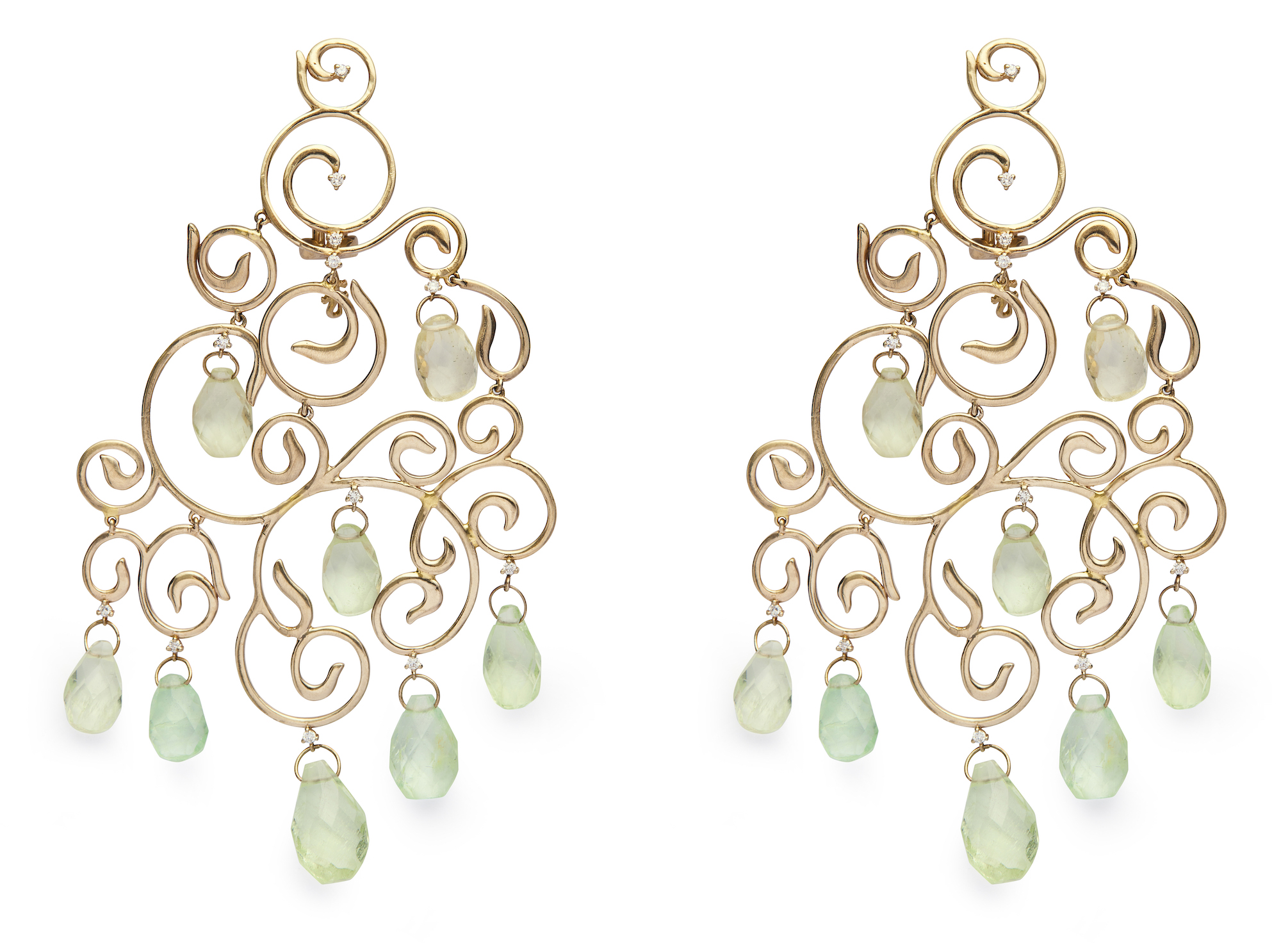 Each of arabesque scroll design supporting briolette aquamarines surmounted by claw-set circular-cut diamonds, post and clip fittings, length approximately 80mm, maker's mark for H. Stern.