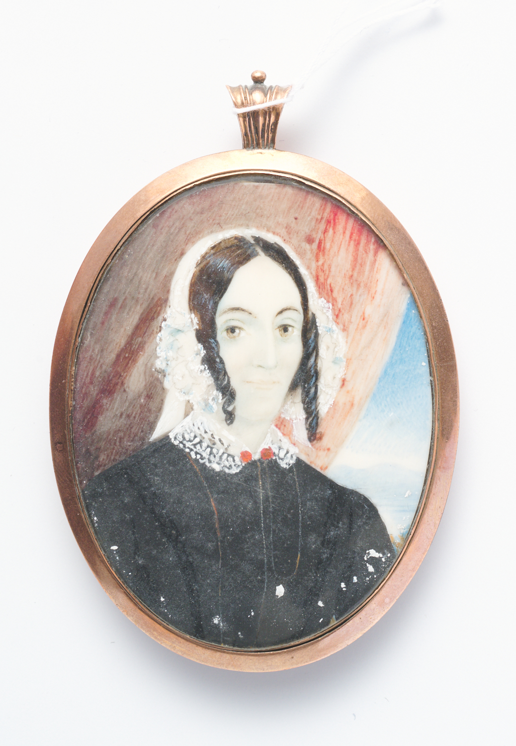 AN ANTIQUE MOURNING LOCKET/PENDANT FEATURING A HAND PAINTED MINIATURE WITH HAIR COMPARTMENT TO REVERSE, IN 9CT ROSE GOLD, LENGTH 85MM