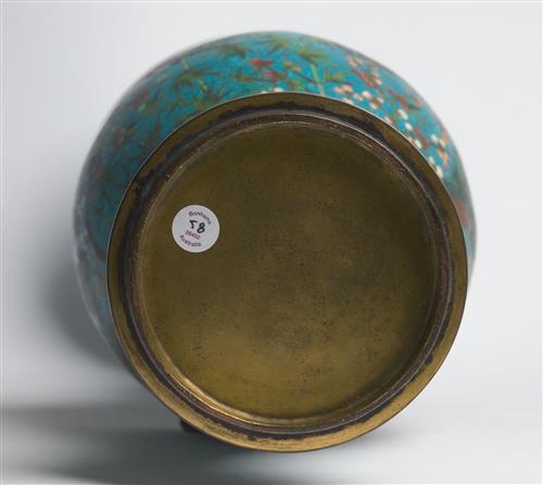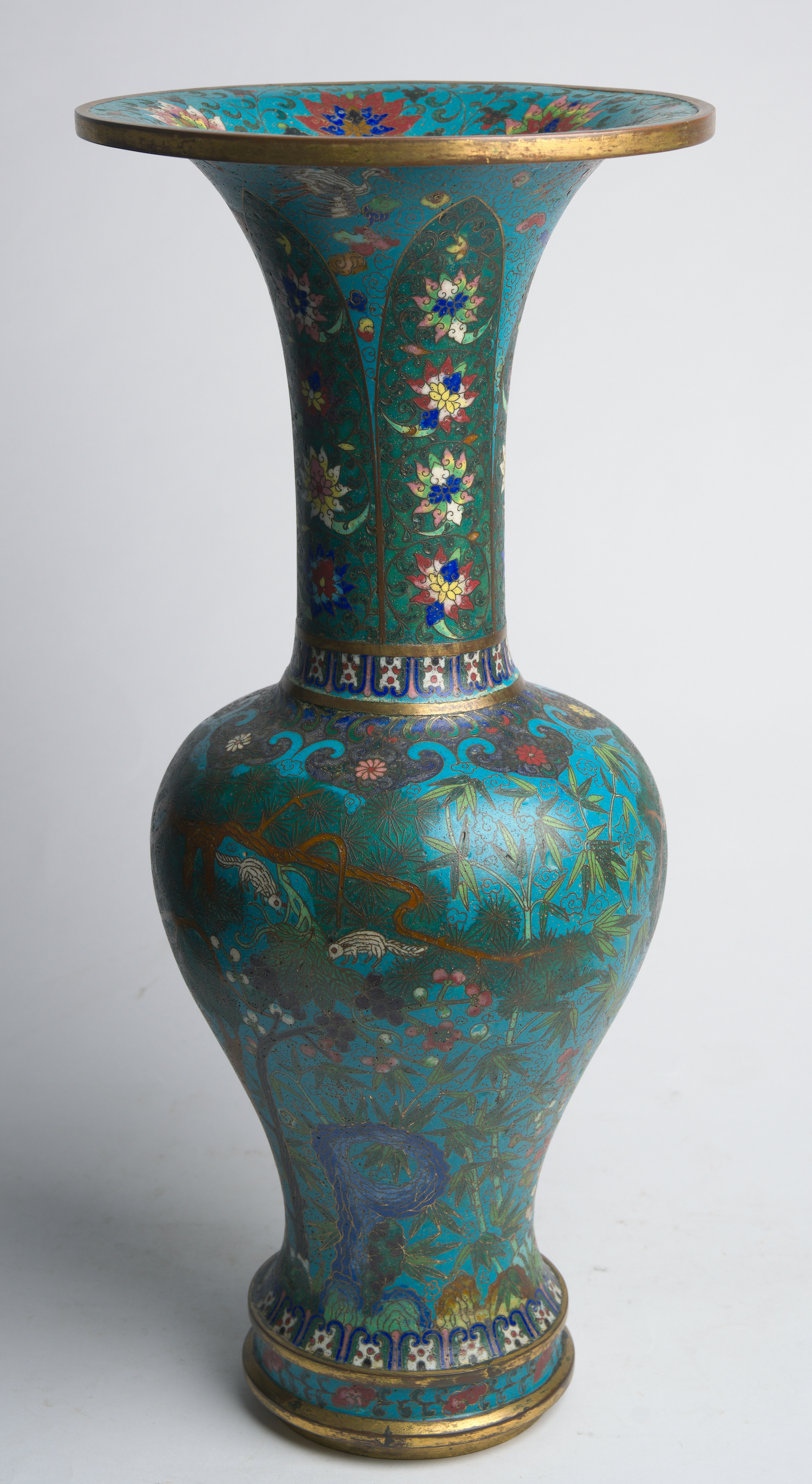 Decorated with the 'three friends of winter', and squirrel and grapes motifs to the sides, and to the neck with scrolling lotus lappets against a crane and cloud ground. The copper edges gilded.