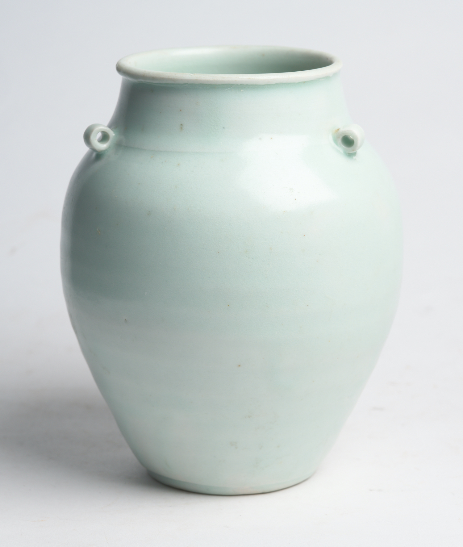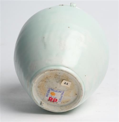 Of elegant baluster form with an inward tapering neck, three lug handles to the shoulder, covered in an even pale blue glaze. Collection number and 'National Museum Philippines' label to base.