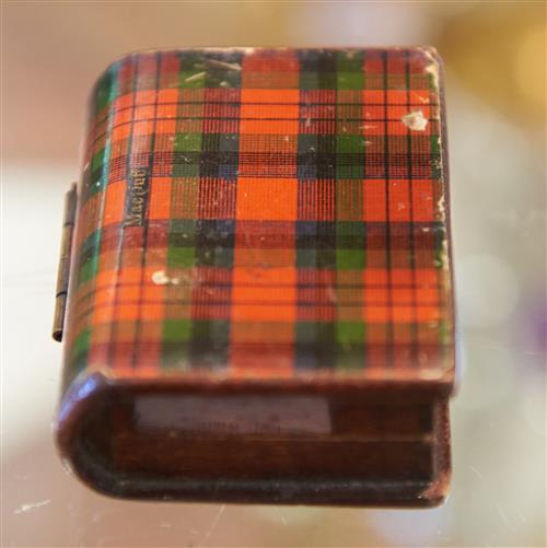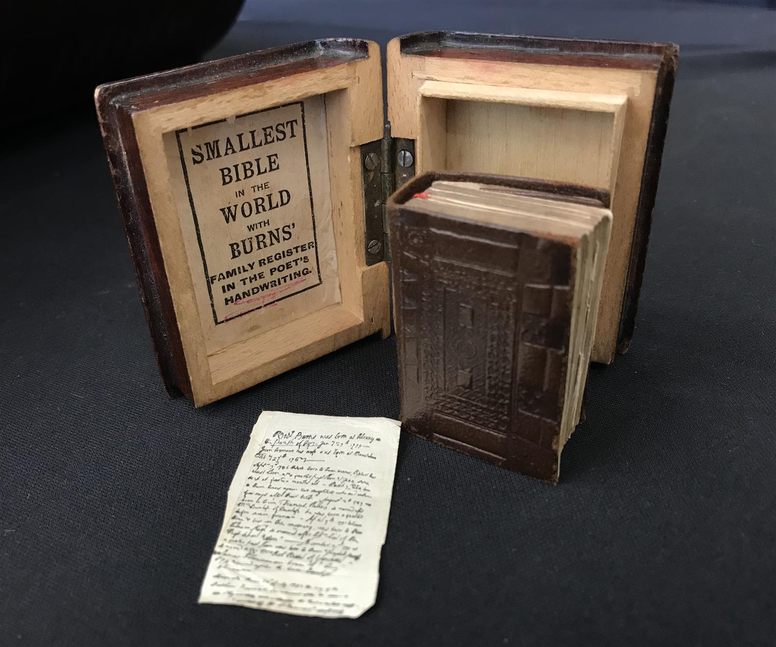 A MINIATURE LEATHER BOUND BIBLE IN TARTAN WOODEN CASE WITH NOTE BY POET ROBBIE BURNS, PUBLISHED IN 1891, MEASUREMENTS OF THE CASE 60MM x 45MM x 20MM, LEONARD JOEL LOCAL DELIVERY SIZE: SMALL