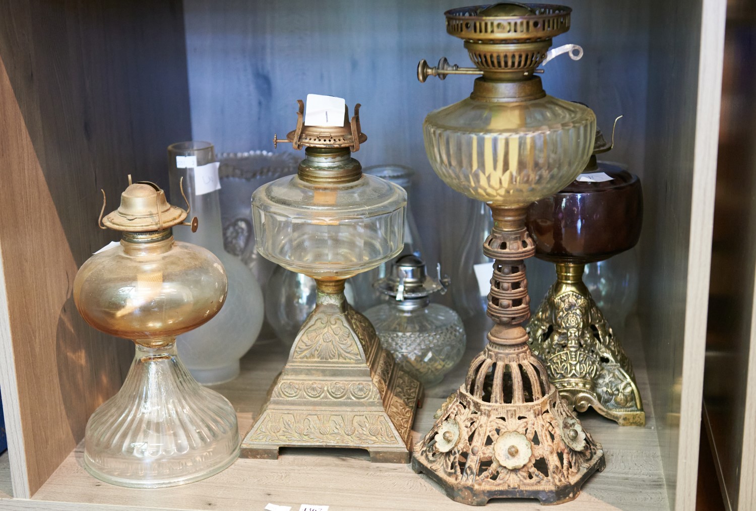 A SHELF LOT OF OIL LAMPS, LEONARD JOEL LOCAL DELIVERY SIZE: SMALL
