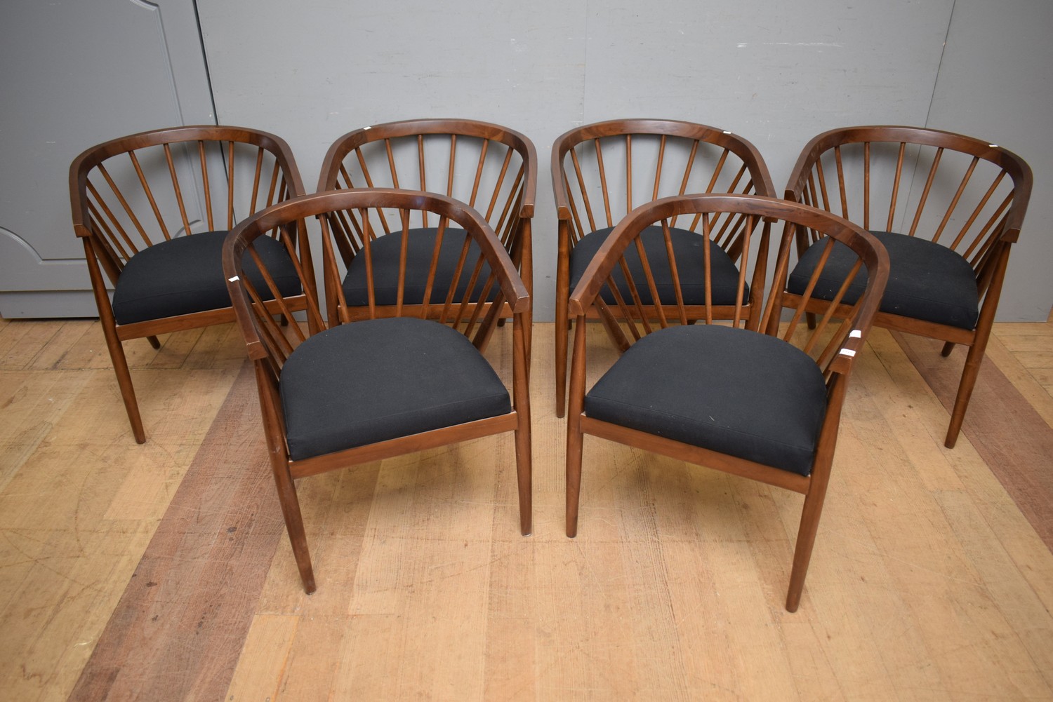 SIX TEAK SPINDLE BACK DINING CHAIRS (75H x 61W x 65D CM) (LEONARD JOEL DELIVERY SIZE: LARGE)