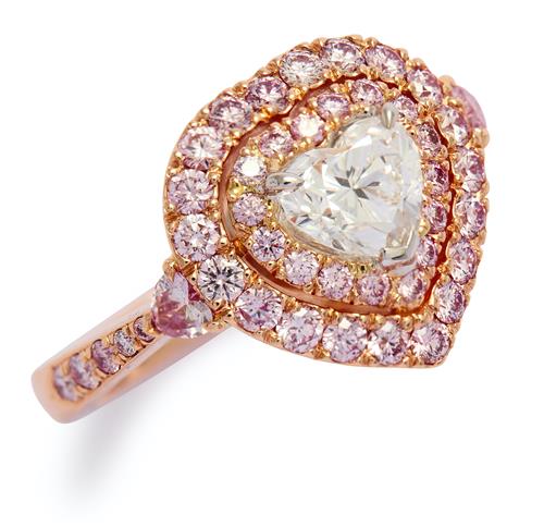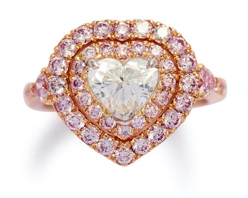 Of cluster design, centring a claw-set heart-shaped near colourless diamond weighing 1.01 carats, framed by a double row of Argyle natural fancy pink pavé-set brilliant-cut diamonds, flanked by an Argyle natural fancy pink heart-shaped diamond, the shoulders and underrail further decorated with fancy pink diamonds, the pink diamonds together weighing approximately 1.14 carats, size M.