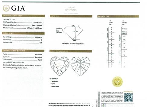Accompanied by a GIA report numbered 5273926185, dated 19 January 2018, stating that the 1.01 carat diamond is E colour, SI1 clarity.