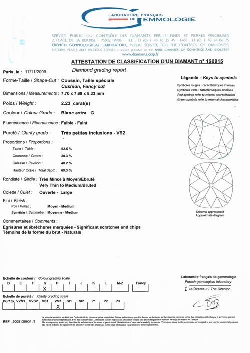 a Laboratoire Francais do Gemmologie report numbered 190915, dated 17 November 2009, stating that the 2.23 carat diamond is natural, G colour, VS2 clarity.