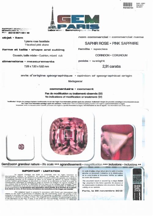 a Gem Paris certificate numbered 20131971121-16, dated 26 November 2013, stating that the 2.91 carat pink sapphire is natural, with no indications of heating, of Madagascar origin;