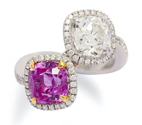 Of toi et moi design with cluster terminals, one claw-set with a cushion-cut natural pink sapphire weighing 2.91 carats, the other similarly set with a cushion fancy-cut diamond weighing 2.23 carats, each framed by pavé-set near colourless brilliant-cut diamonds, between shoulders accented by similarly set diamonds, the underrail decorated with near colourless and Argyle natural fancy pink diamonds, the near colourless and fancy pink diamonds together weighing approximately 0.48 carat and 0.03 carat respectively, size M1/2.