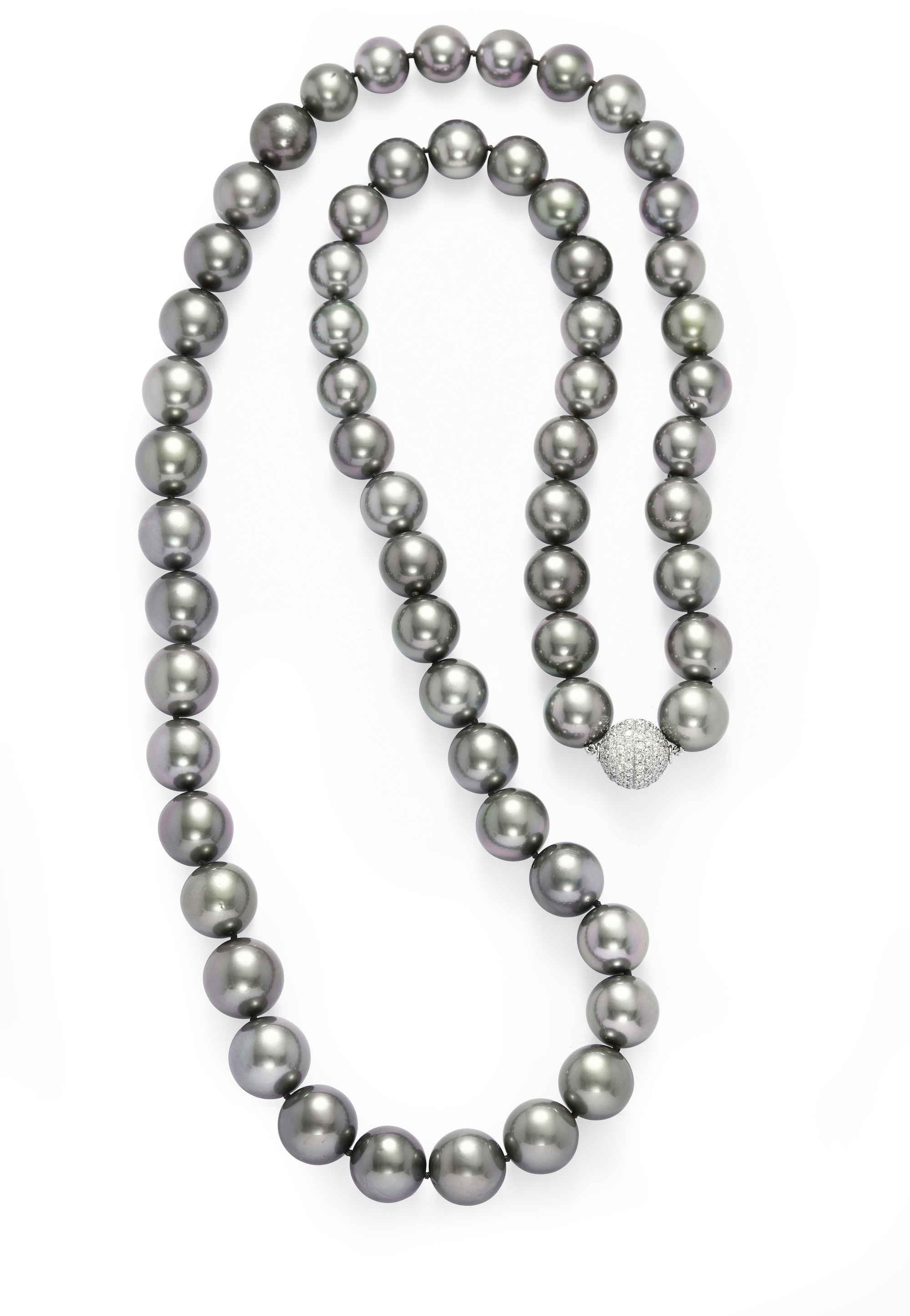 Composed of 61 cultured pearls of fine grey hue graduating from approximately 12.20mm to 16.10mm, completed by a platinum ball clasp pavé-set with brilliant-cut diamonds together weighing approximately 3.86 carats, circumference approximately 900mm.