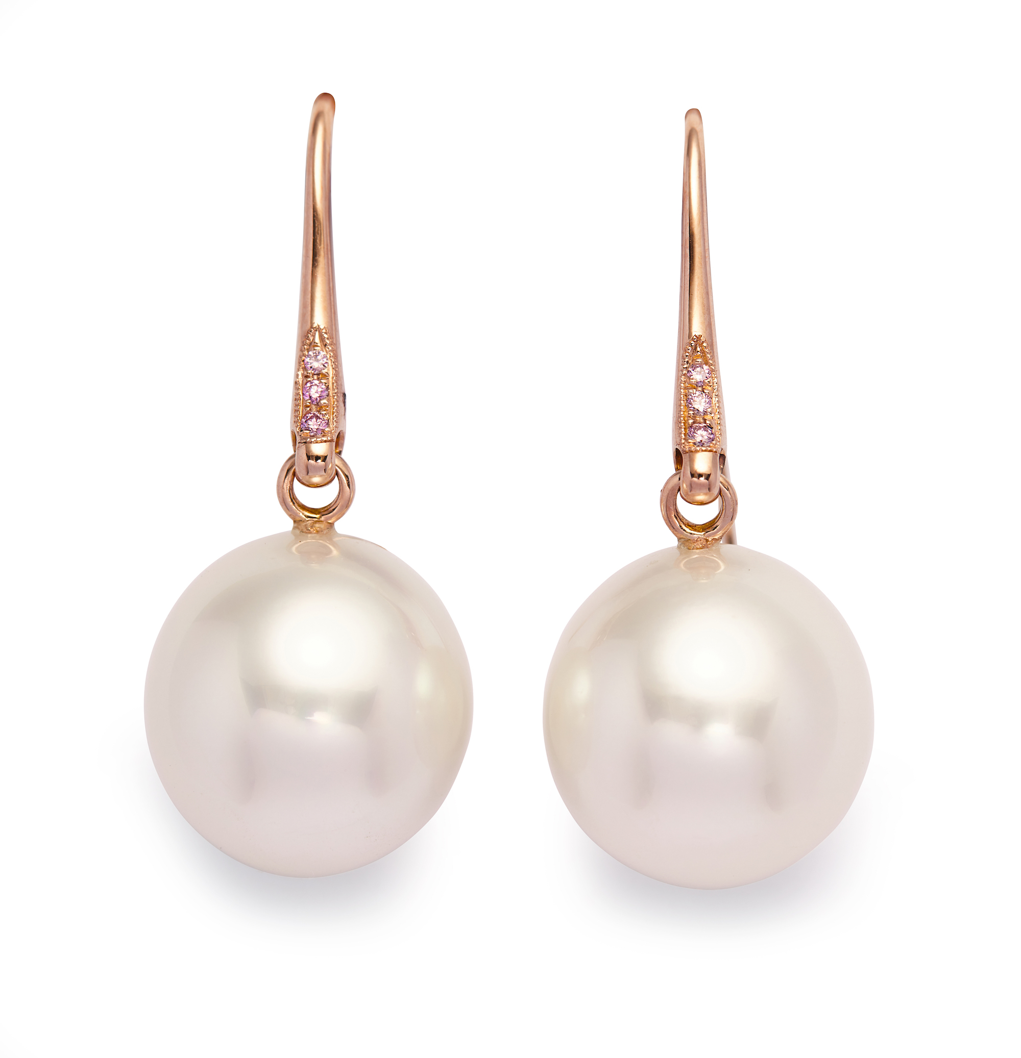 PAIR OF 18CT ROSE GOLD, AUSTRALIAN SOUTH SEA PEARL AND ARGYLE FANCY PINK DIAMOND EARRINGS