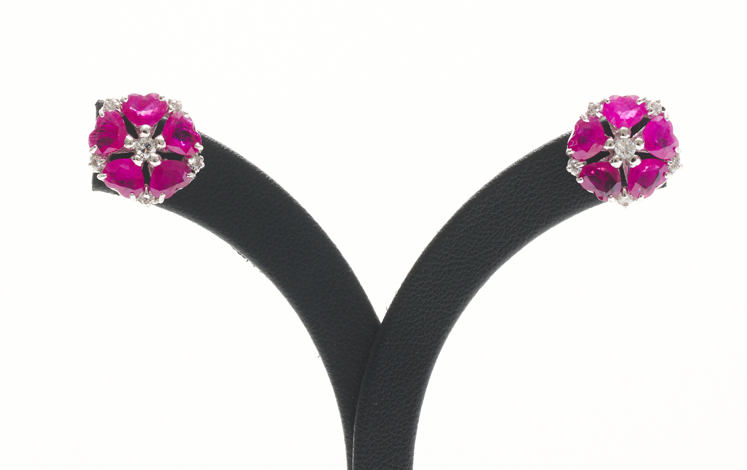 A PAIR OF BURMESE RUBY AND DIAMOND EARRINGS IN 18CT WHITE GOLD, COMPRISING HEART SHAPED RUBIES TOTALLING 6.08CTS, TO POST FITTINGS, DIAMETER 13MM