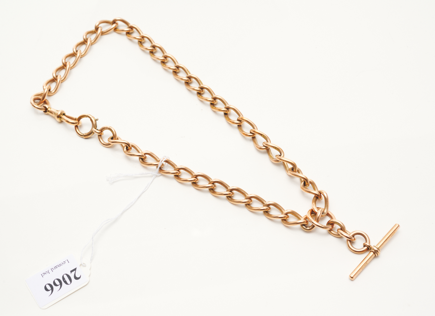 AN ANTIQUE T-BAR NECKLACE IN 9CT GOLD, TOTAL LENGTH 440MM, 64GMS