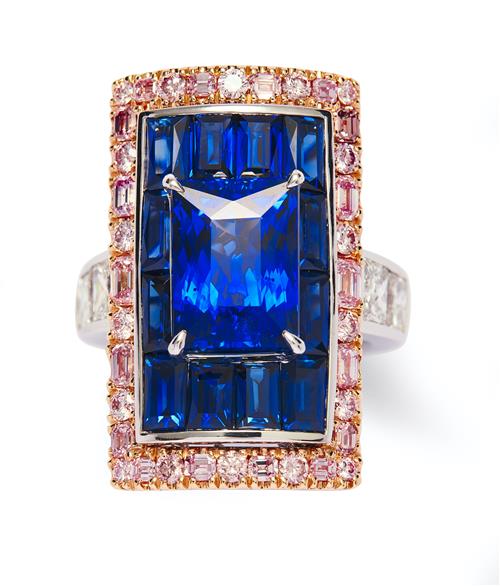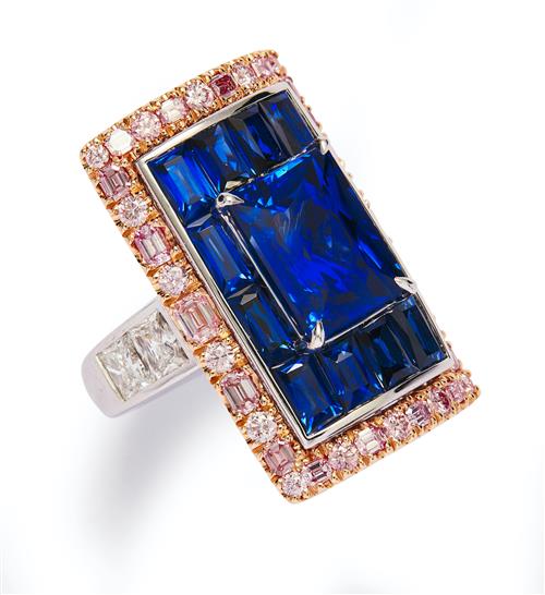 Of cluster design centring a claw-set emerald-cut royal blue sapphire weighing 7.13 carats framed by a line of similarly cut stones bordered by Argyle natural fancy pink baguette and brilliant-cut diamonds, the undercarriage decorated in an openwork scroll pattern collet-set with Argyle fancy pink diamonds, between near colourless diamond shoulders, the small sapphires and pink diamonds together weighing approximately 4.15 carats and 3.28 carats respectively, size L.