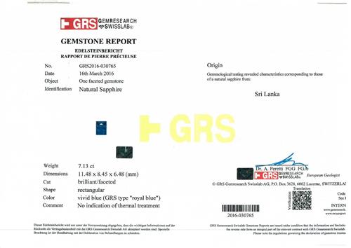 Accompanied by a GRS report numbered GRS2016-030765, dated 16 March 2016, stating that the 7.13 carat sapphire is natural, with no indications of heating, of Sri Lanka origin.