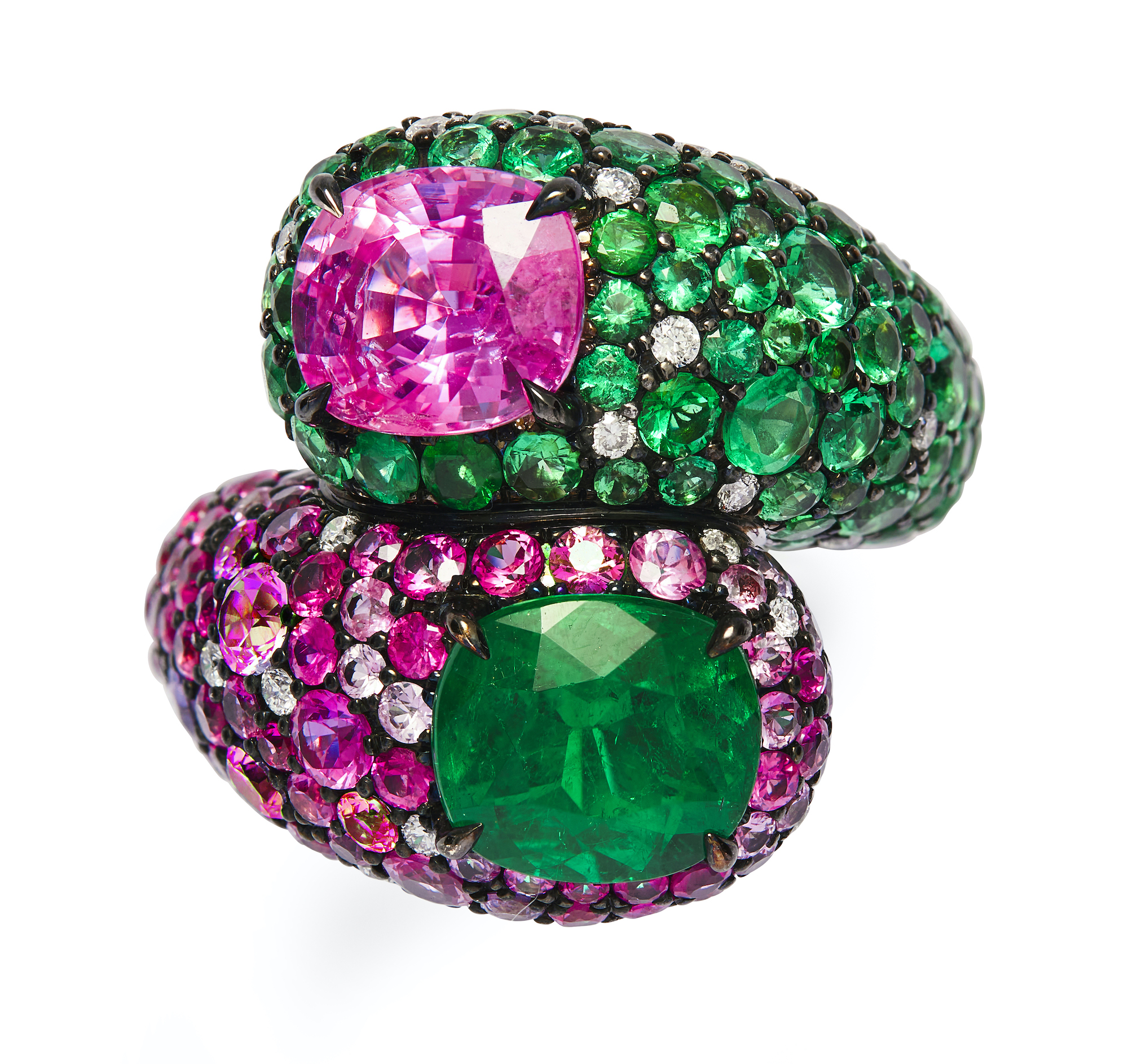 Of toi et moi design with bombe terminals, one claw-set with a cushion-shaped emerald weighing 2.56 carats framed by pavé-set brilliant-cut diamonds between circular-cut pink sapphires, the other claw-set with a cushion-shaped pink sapphire weighing 2.60 carats framed by pavé-set diamonds between circular-cut emeralds in blackened gold, the small emeralds, sapphires and diamonds together weighing 2.03 carats, 2.66 carats and 0.26 carats respectively, size N1/2.