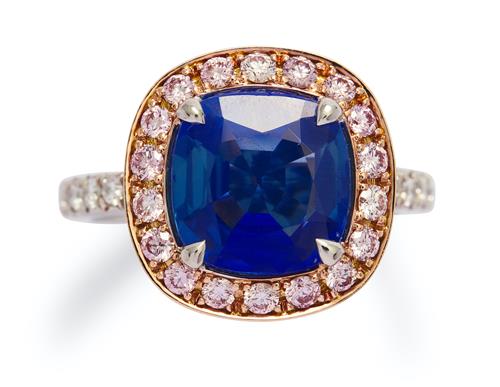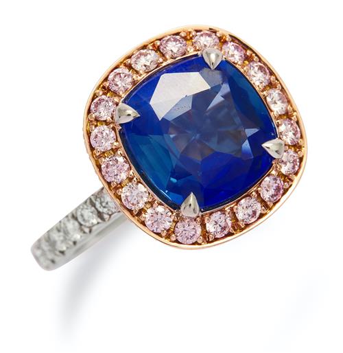 Of cluster design, centring a claw-set cushion-shaped Kashmir sapphire weighing 3.67 carats, framed by a line of Argyle natural fancy pink brilliant-cut diamonds, the gallery and underrail pavé-set with pink diamonds, between shoulders bead-set with near colourless diamonds, the fancy pink and near colourless diamonds together weighing approximately 0.98 carat and 0.29 carat respectively, size M.