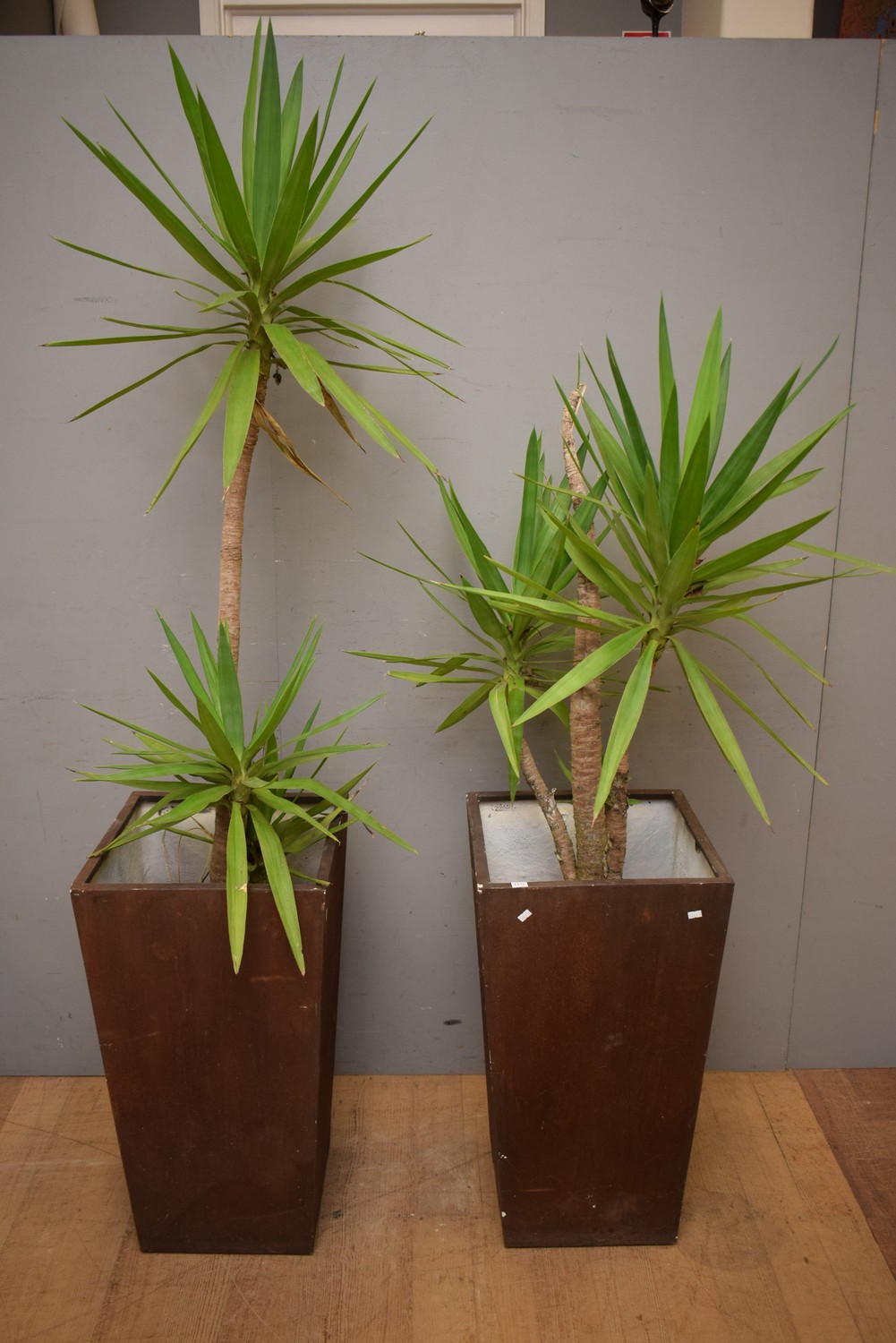 TWO LARGE YUKKAS IN COMPOSITE POTS (A/F) (207H CM) (PLEASE NOTE THIS HEAVY ITEM MUST BE REMOVED BY CARRIERS AT THE CUSTOMER'S EXPENSE. LEONARD JOEL STAFF CANNOT ASSIST CARRYING THIS ITEM) (X-LARGE ITEM)