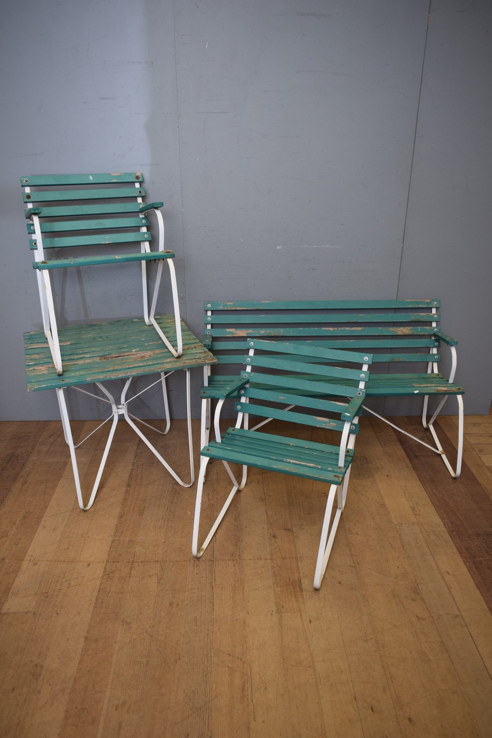 A FOUR PIECE WROUGHT IRON AND TIMBER OUTDOOR SETTING (A/F) (LARGEST 71H x 122W x 61D CM) (PLEASE NOTE THIS HEAVY ITEM MUST BE REMOVED BY CARRIERS AT THE CUSTOMER'S EXPENSE. LEONARD JOEL STAFF CANNOT ASSIST CARRYING THIS ITEM) (X-LARGE ITEM)