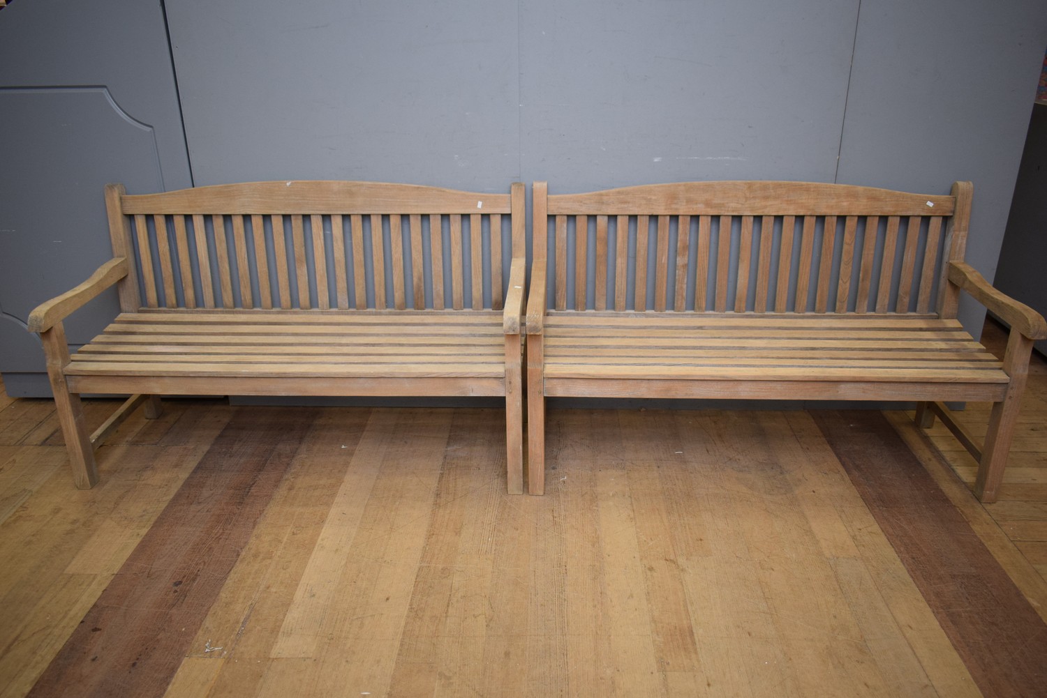 A PAIR OF TEAK BENCHES (A/F) (H91 X W150 X D65 CM) (PLEASE NOTE THIS HEAVY ITEM MUST BE REMOVED BY CARRIERS AT THE CUSTOMER'S EXPENSE. LEONARD JOEL STAFF CANNOT ASSIST CARRYING THIS ITEM) (X-LARGE ITEM)