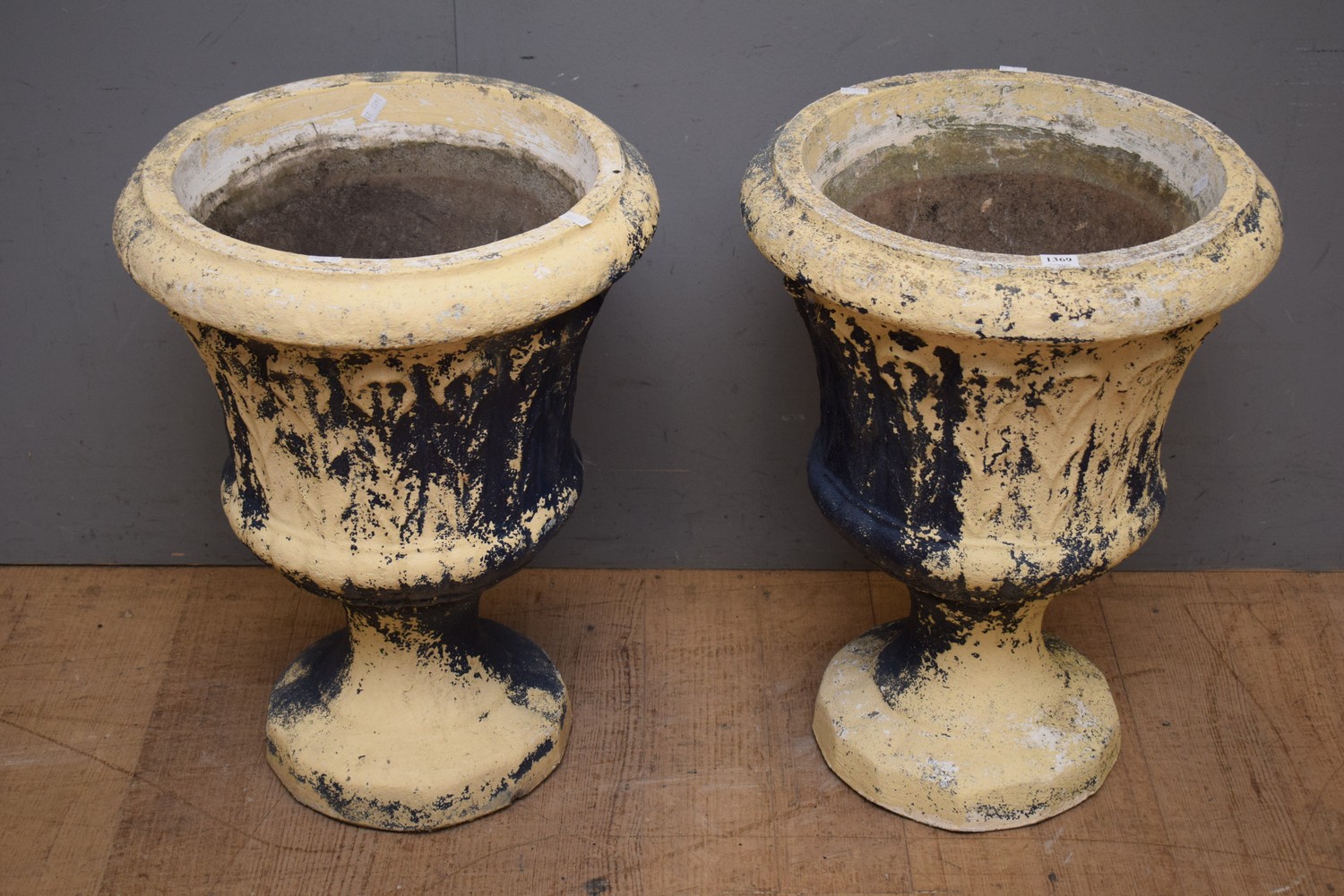 A PAIR OF CLASSICAL STYLE CONCRETE URNS (A/F) (55H x 38D CM) (PLEASE NOTE THIS HEAVY ITEM MUST BE REMOVED BY CARRIERS AT THE CUSTOMER'S EXPENSE. LEONARD JOEL STAFF CANNOT ASSIST CARRYING THIS ITEM) (X-LARGE ITEM)