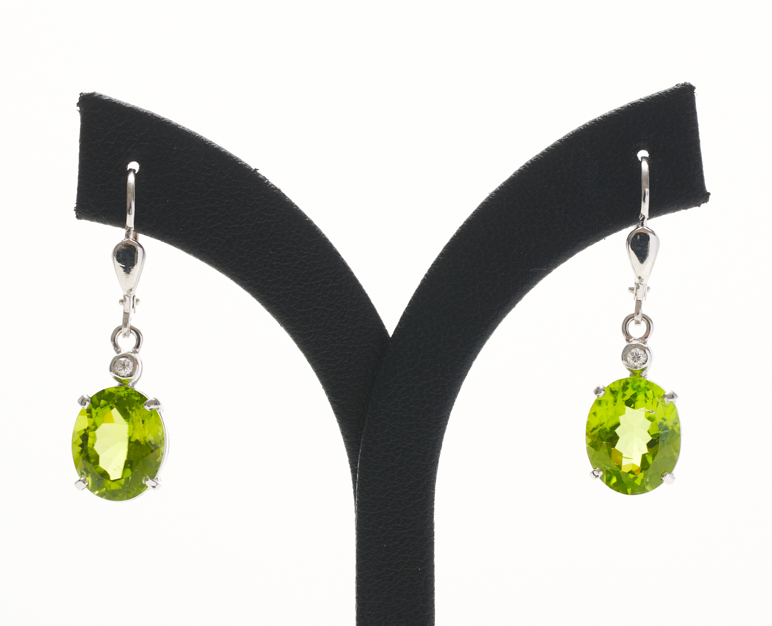 A PAIR OF PERIDOT AND DIAMOND EARRINGS IN 18CT WHITE GOLD, TO LEVER BACK FITTINGS, THE PERIDOTS WEIGHING 4.6CTS EACH, THE DIAMONDS 0.20CTS, COLOUR H, CLARITY SI, LENGTH 30MM, WITH VALUATION