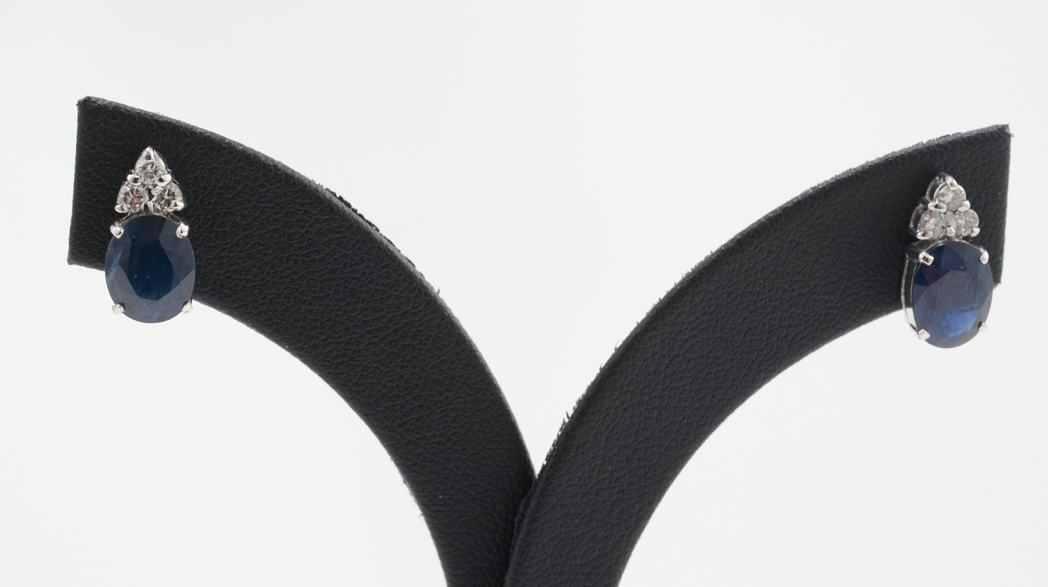 A PAIR OF SAPPHIRE AND DIAMOND EARRINGS IN 18CT WHITE GOLD, EACH OVAL CUT BLUE SAPPHIRE WEIGHING 2.10CTS, TO POST FITTINGS