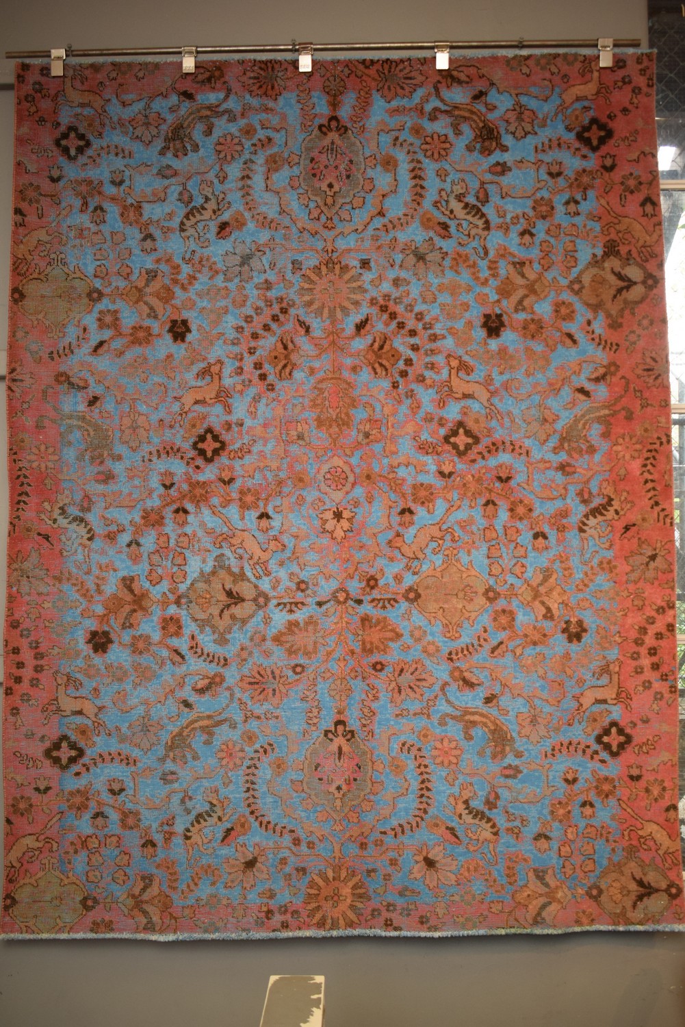 A MAGNIFICENT CONTEMPORARY VINTAGE PILE PERSIAN TABATABAEI TABRIZ CARPET. THE RARE DESIGN DEPICTING ANIMAL FORMS OF TIGER AND DEER. SET ON A LOVELY SKY-BLUE BACKGROUND AND FLORAL SPRAYS. THE ENTIRE IN SKY BLUE, TAN & PEACH TONES. A TRULY UNIQUE PIECE. CERTIFICATE OF AUTHENTICITY INCLUDED. SIZE: 227X172CM ORIGIN: PERSIA - RRP: $4,400