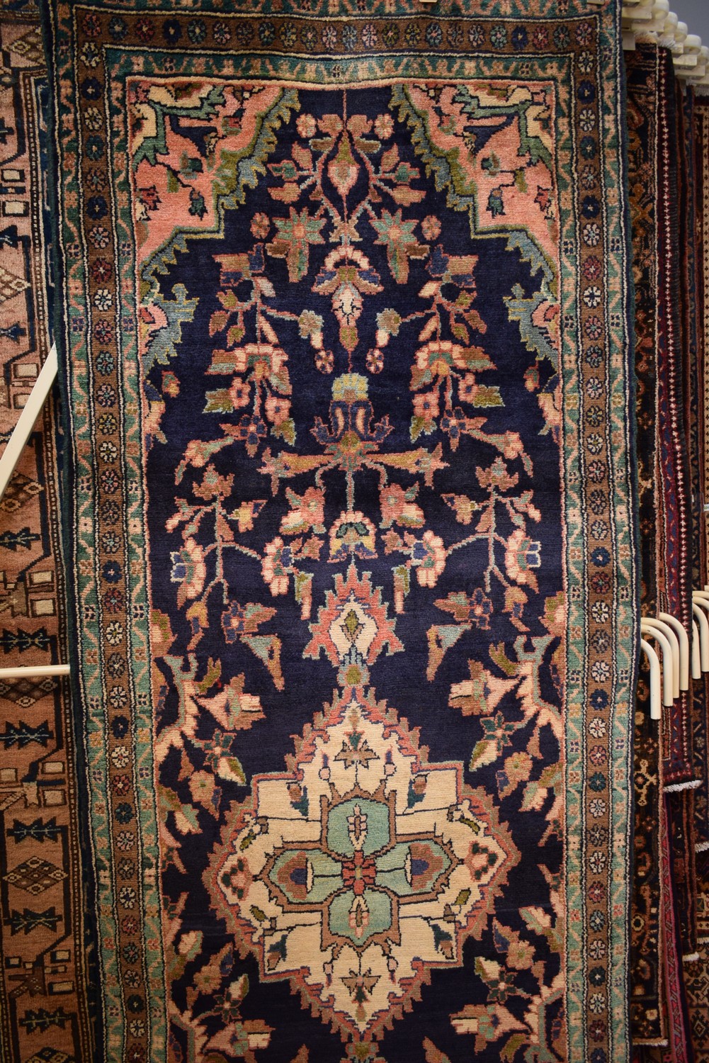 A PERSIAN MEHRABAN HALL RUNNER, 100% WOOL. DENSE PILE. STURDY & HARD-WEARING. FINELY HAND-KNOTTED VILLAGE WEAVE WITH TRADITIONAL DESIGN OF CENTRAL FLORAL MEDALLION & CORNER MEDALLIONS IN AN INDIGO BLUE FIELD OF FLORAL SPRAYS & TENDRILS. FLORAL-PATTERNED BORDER IN A LOVELY TURQUOISE GREEN. IN EXCELLENT CONDITION. CERTIFICATE OF AUTHENTICITY INCLUDED.  SIZE: 304X105CM ORIGIN: PERSIA - RRP: $3,200