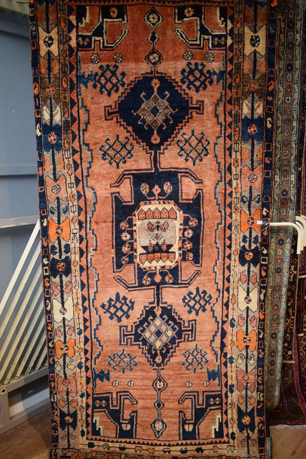 A TRIBAL PERSIAN KOHI RUG, 100% WOOL. NATURAL DYES WITH NATURAL ABRASH DISCOLORATION. HAND-KNOTTED TRIBAL WEAVE WITH DESIGN OF BOLD ANCHORED MEDALLION IN A FIELD OF TRIBAL PATTERNS. BORDER OF ROSETTES. EX-GALLERY INVENTORY. IN GOOD CONDITION. CERTIFICATE OF AUTHENTICITY INCLUDED. SIZE: 265x120CM ORIGIN: PERSIA - RRP: $2,800