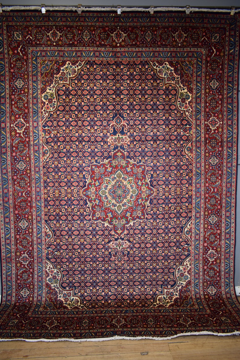 AN EXCEPTIONAL AND INTERESTING PERSIAN KERMANSHAH RUG 100% DENSE KORK WOOL PILE. EXTREMELY FINE QUALITY WITH AN ALL OVER, NAVY-TONED FIELD OF HERATI MAHI PATTERNS IN SHADES OF ROYAL BLUE, RED & CREAM. WITH A SPECTACULAR SUNBURST MEDALLION. HERATI-PATTERNED BORDER. GALLERY INVENTORY. IN EXCELLENT CONDITION. CERTIFICATE OF AUTHENTICITY INCLUDED. SIZE: 380X269CM ORIGIN: PERSIA - RRP: $9,500
