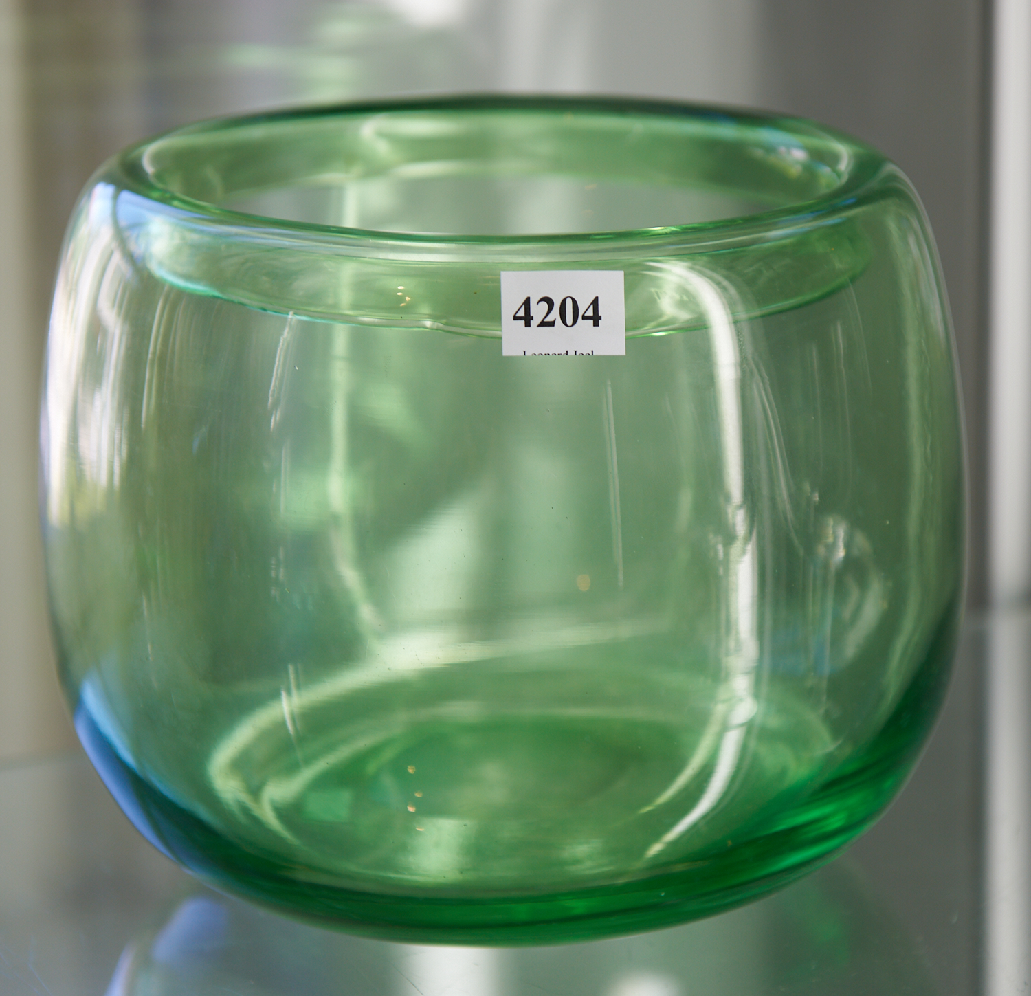 A HANDBLOWN GREEN GLASS BOWL (15H X 20W CM), LEONARD JOEL LOCAL DELIVERY SIZE: SMALL