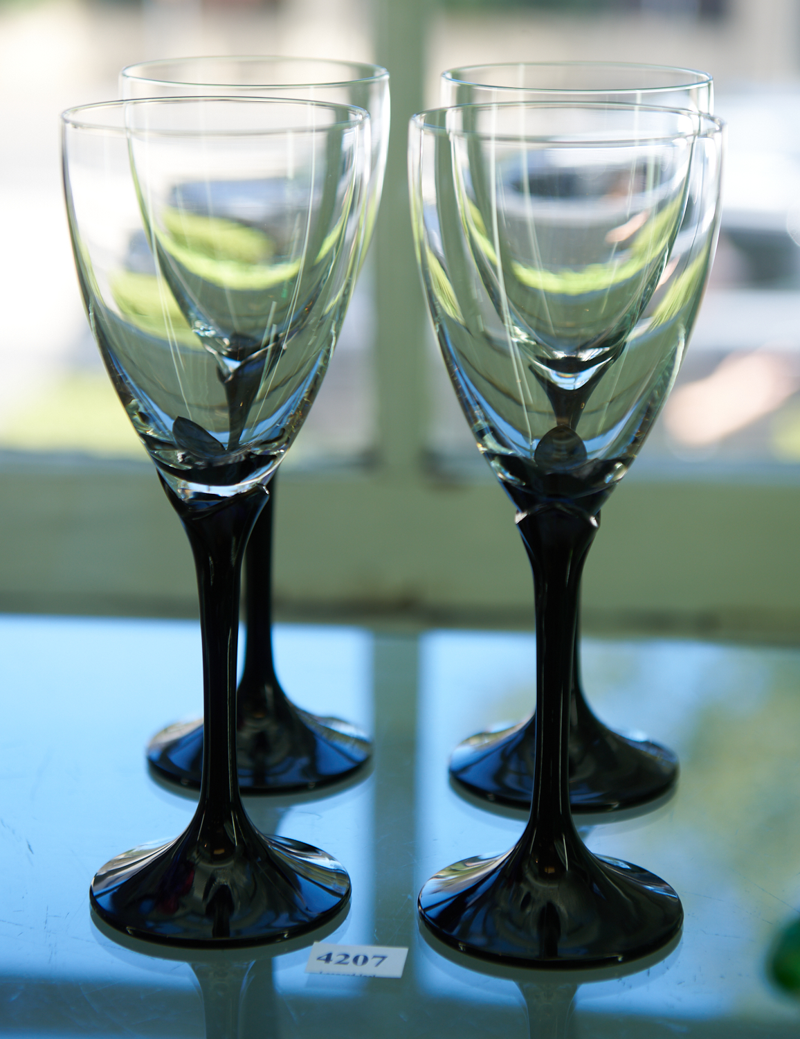 FOUR BLACK STEM CRYSTAL GLASSES, LEONARD JOEL LOCAL DELIVERY SIZE: SMALL