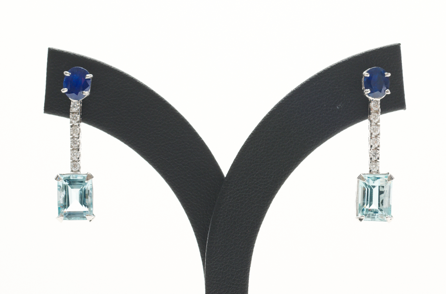 A PAIR OF AQUAMARINE, SAPPHIRE AND DIAMOND DROP EARRINGS IN 18CT WHITE GOLD, LENGTH 30MM.
